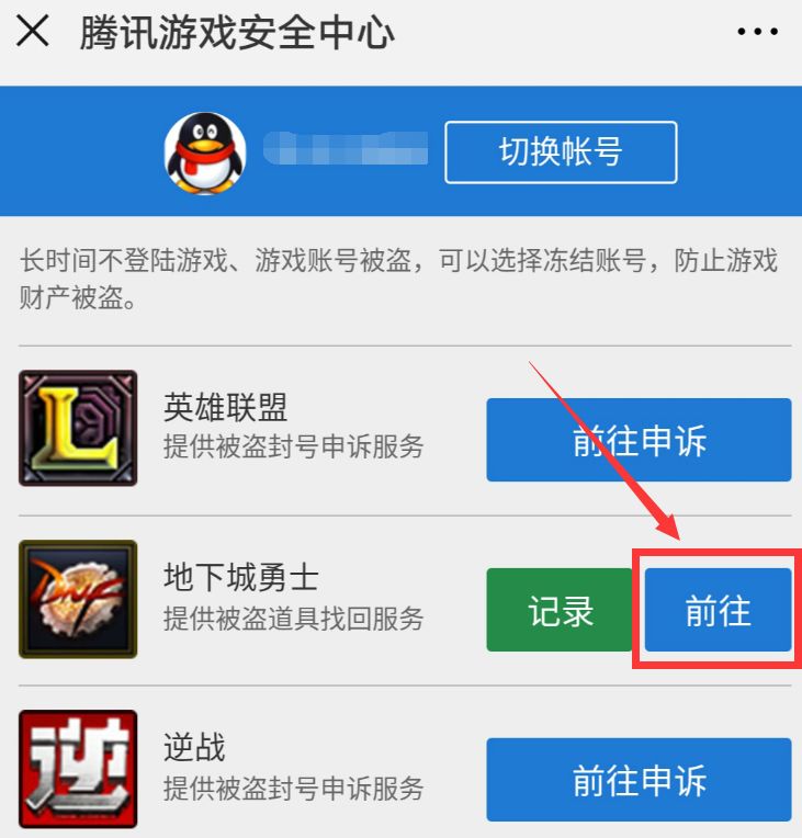 第五步:进入“被盗服务”后,点击“前往”即可进行被盗道具找回服务!