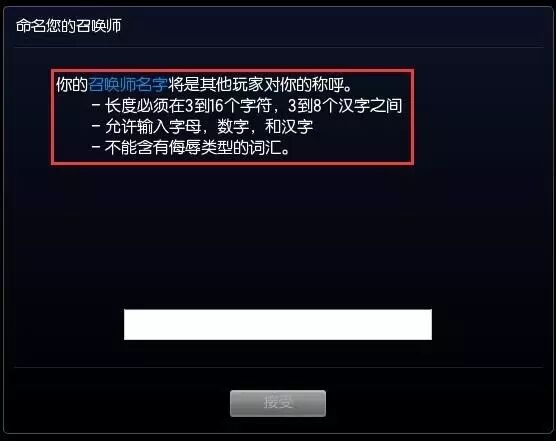 当然,并不是所有字符都会被列为非法范围呢。在各位召唤师们创建游戏角色之初,游戏界面就有相关的成文规定(如图),召唤师们可以按照规定修改角色昵称。